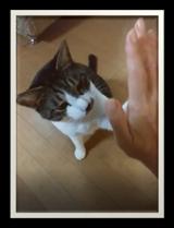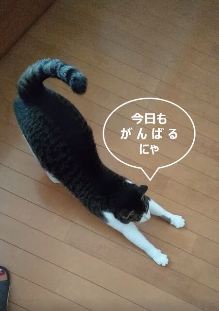 ベッドから降りて朝イチの伸び伸びをしながら「今日もがんばるにゃ」と言っているようで、朝から元気づけてくれるし、